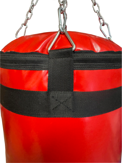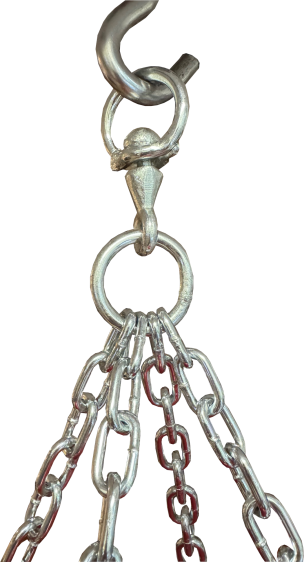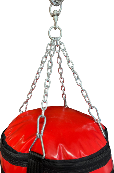 Zawieszenie: 4 mocne łańcuchy (27 cm długości), połączone karabińczykami z trójkątnymi uchwytami (bok 6 cm), wszytymi w korpus worka